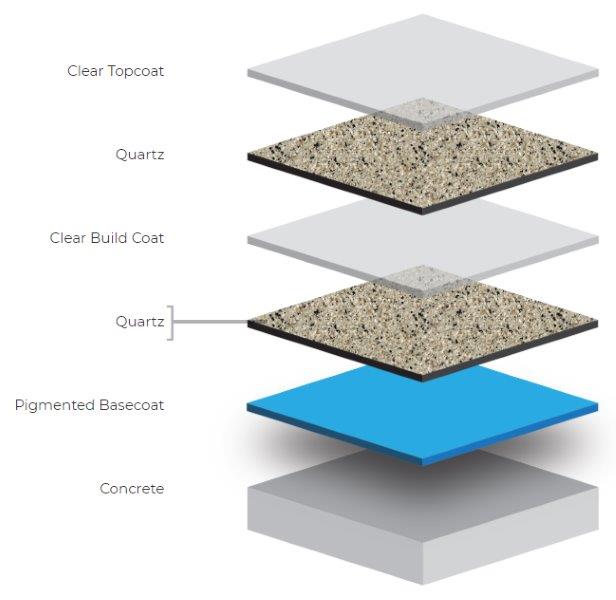 Pigmented basecoat or primer with Quartz Aggregate: This is the first layer of epoxy coating that is applied to the prepared substrate. It acts as a bonding agent, promoting adhesion between the substrate and the subsequent layers. The primer also includes a broadcast of quartz aggregate, which helps to create a mechanical bond between the epoxy and the substrate.
